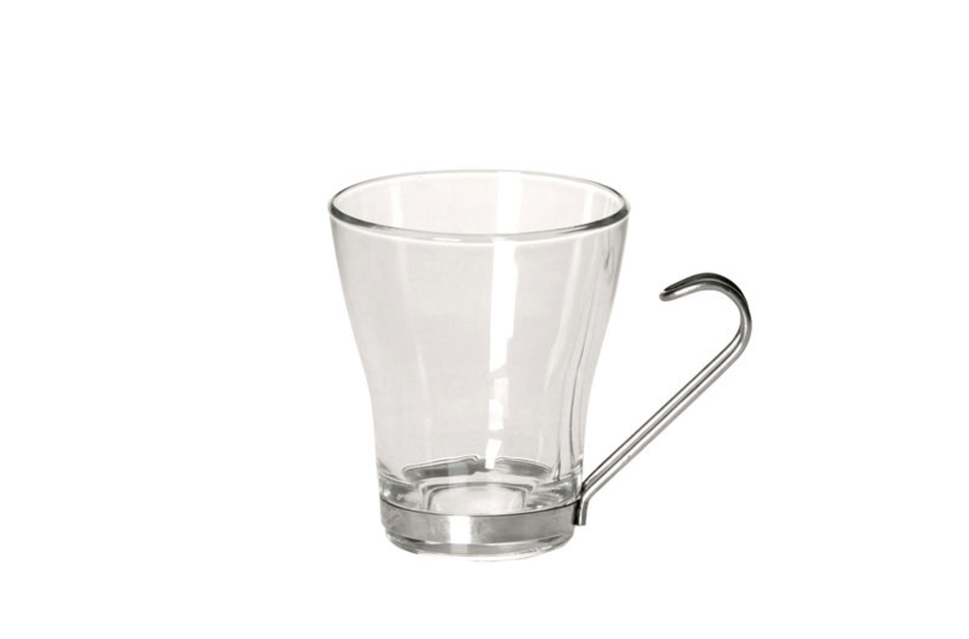 tazza per thé, tisane e cappuccino, dalla linea pulita e realizzata in vetro temperato per resistere agli usi più gravosi. manico in acciaio inox.