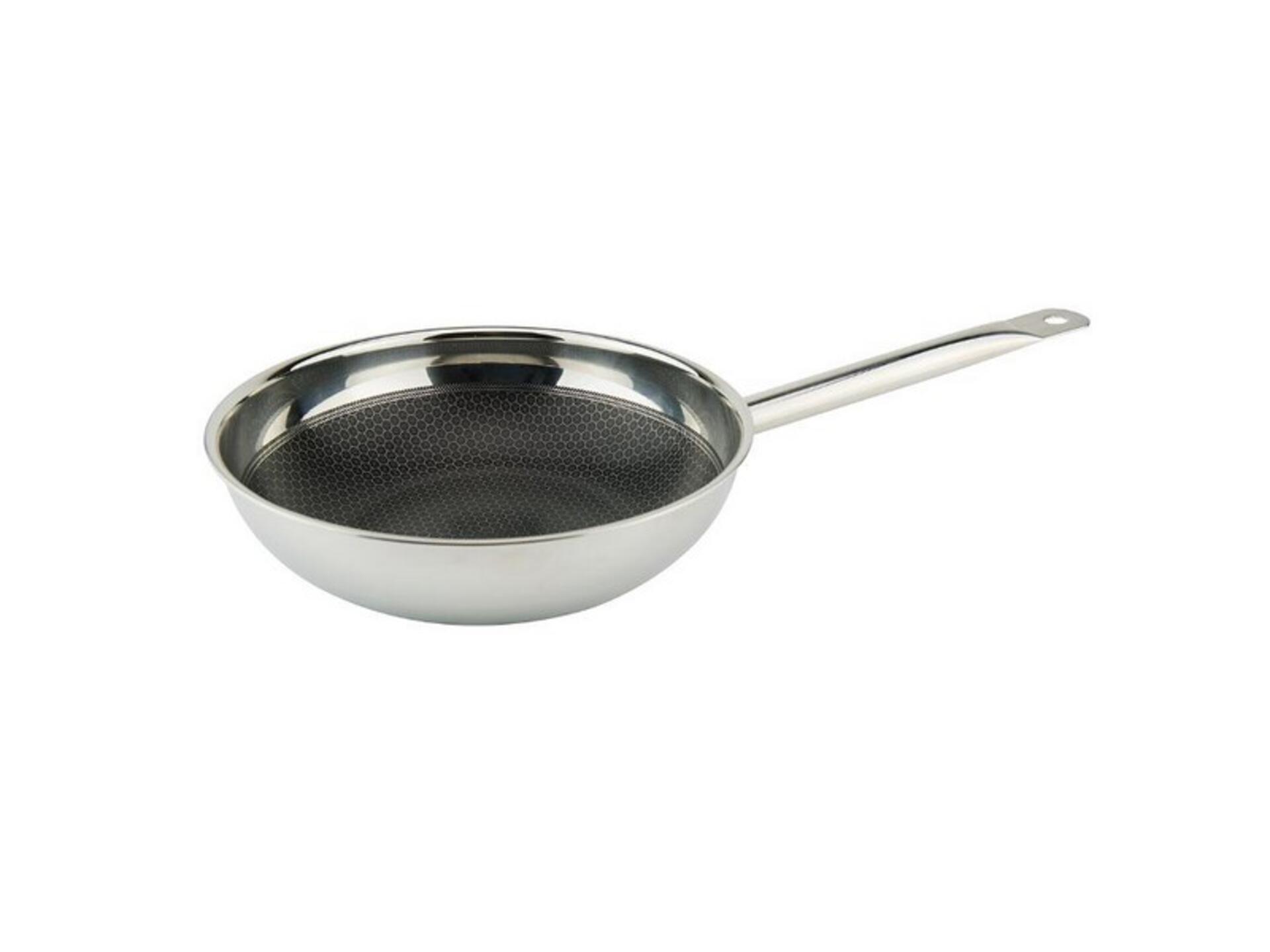 Una nuova tecnologia ora disponibile anche per pentolame professionale, queste padelle e wok in tri-materiale inox-alluminio-inox, non perdono in nessun modo il supporto antiaderente grazie al fatto che è celato al disotto di minuscoli alveoli di saldatura. i materiali abrasivi come mestoli cucchiai forchettoni non arrivano a toccare il rivestimento.