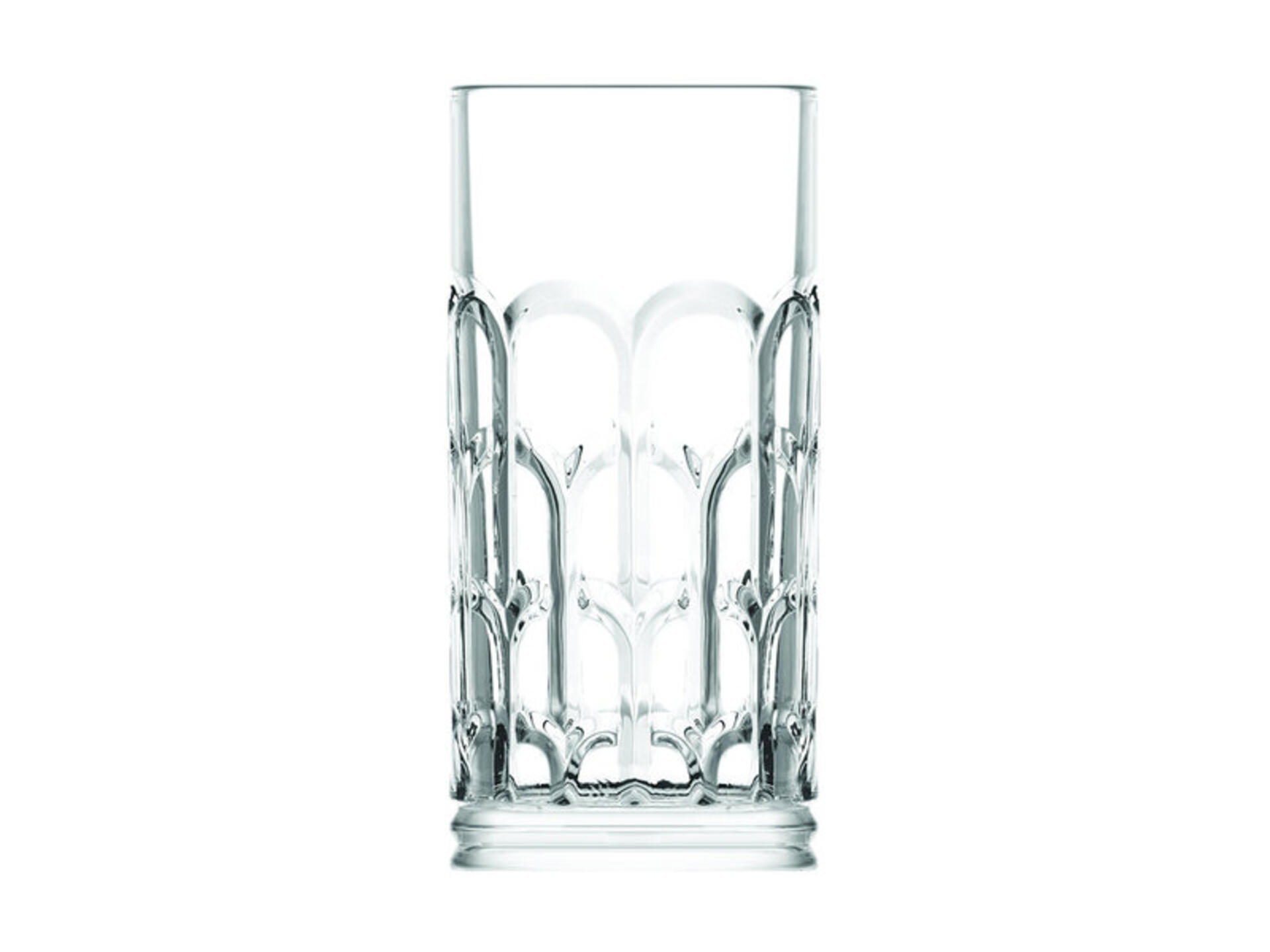 bicchiere della linea archie in vetro professionale con eleganti archi curvi che evocano la grandiosità degli edifici classici. prodotto concepito per offrire massima resistenza e un forte impatto visivo nel settore barware. compatibile con lavastoviglie professionali.